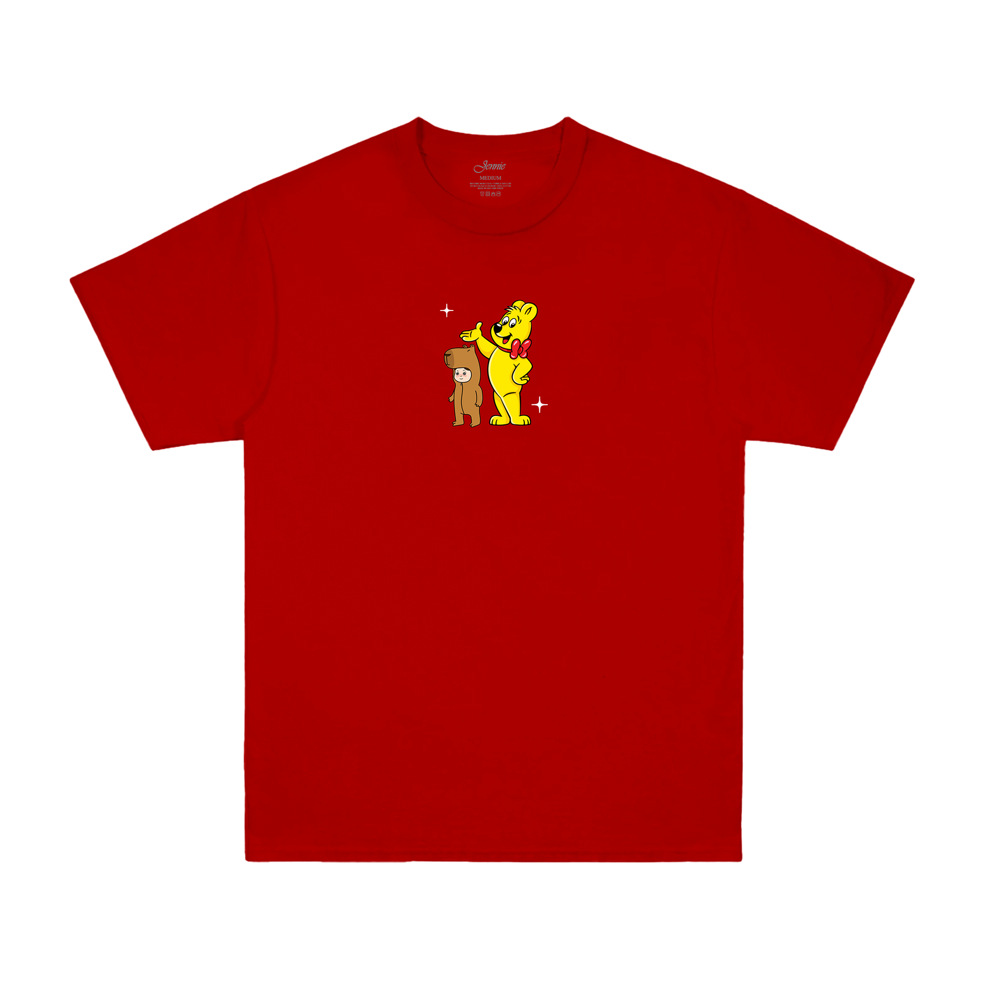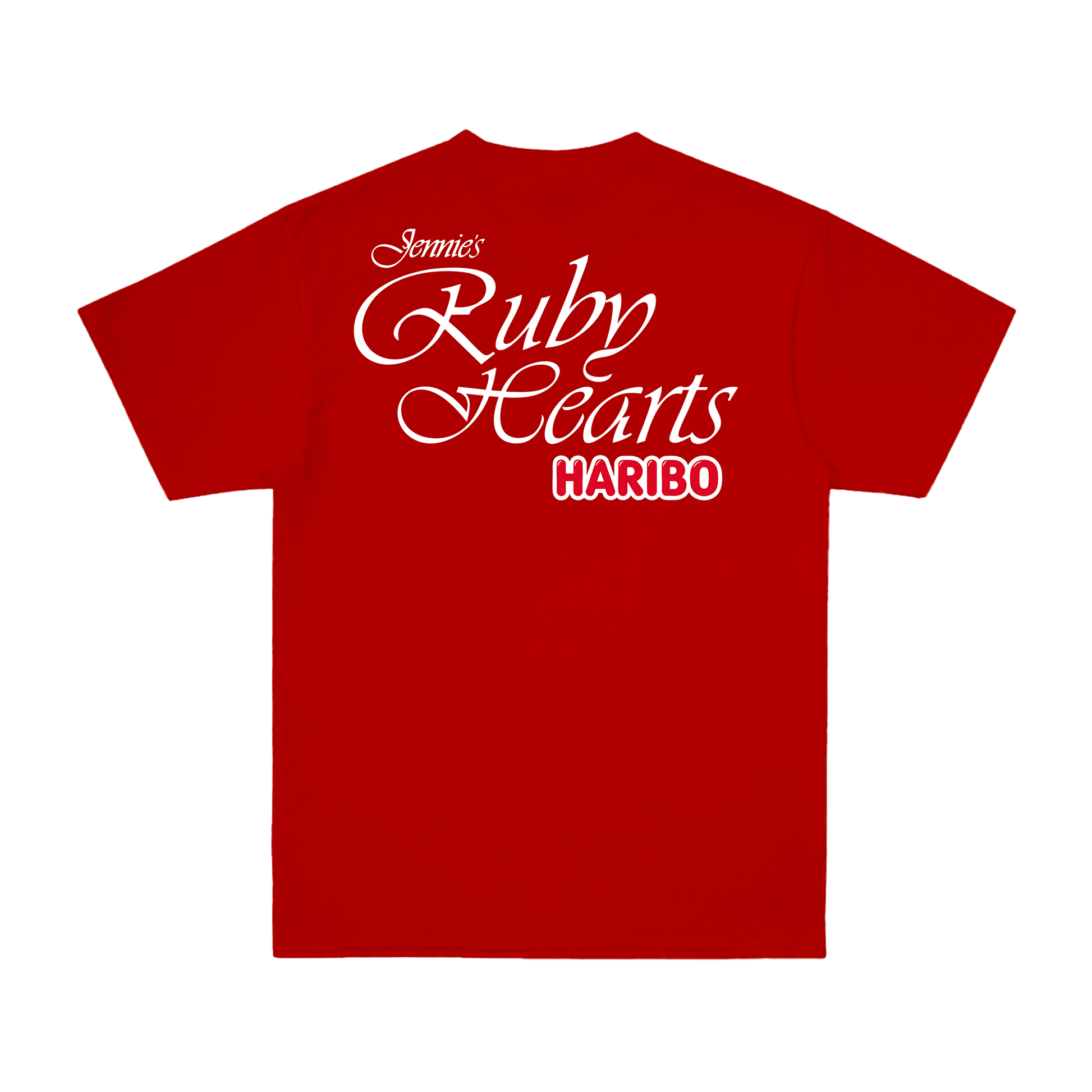 Red tee featuring JENNIE x Haribo graphic printed in white on the front and back.